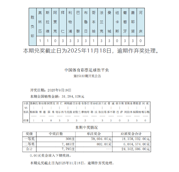 9月19日,足彩第25133期开奖结果公布。14场比赛的1等奖开出308注,每注奖金为59,604元,成功清空了434万元的滚存奖金。此外,14场2等奖开出7487注,单注奖金为308元,任九则出现了38313注中奖,每注奖金为351元。本期胜负彩总销量达到31,284,128元,任九投注总额为21,037,466元。