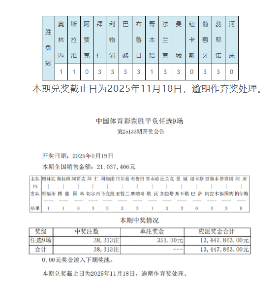 9月19日,胜负彩第25133期任九开奖结果公布。本期任九中奖注数为38313注,每注奖金为351元,任九投注总额为21,037,466元。