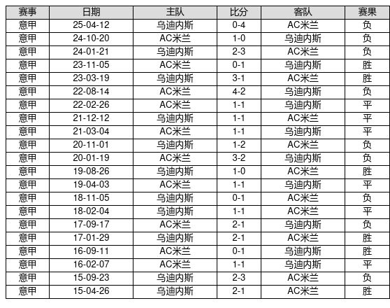 乌迪内斯 VS AC米兰两队近10年的交战次数为21场,乌迪内斯6胜6平9负,赢球概率为28.6%,平局概率为28.6%,输球概率为42.9%。