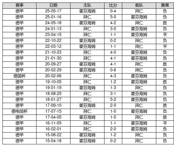 霍芬海姆 VS 拜仁两队近10年的交战次数为23场,霍芬海姆5胜3平15负,赢球概率为21.7%,平局概率为13.0%,输球概率为65.2%。