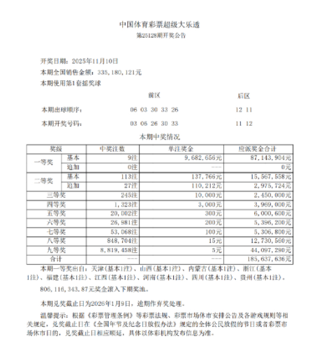 北京时间11月10日晚,体彩大乐透第25128期开奖,当期开奖号码为:前区03 06 26 30 33,后区11 12。