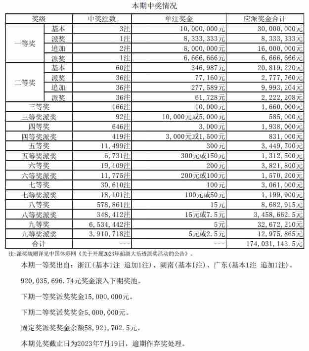 本期大乐透二等奖开出60注,单注奖金34.6万元,追加后单注奖金为62.4万元,另有36注追加投注符合派奖条件,单注派奖13.8万元,派奖后单注奖金达76.3万元。一等奖和二等奖派奖奖金全部派出,下期大乐透一等奖派奖奖金为15,000,000元,二等奖派奖奖金5,000,000元;固定奖派奖奖金剩余金额为58,921,702.5元。本次派奖只针对追加投注且单张单期投注金额15元及以上的奖票,活动预计持续20期。