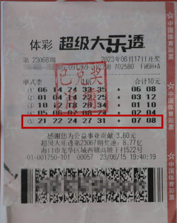 6月17日晚,体彩超级大乐透第23068期开奖,中奖号码为:21、22、24、27、31 + 07、08,当期全国共开出7注一等奖,每注奖金1000万元。我省购彩者喜中1注一等奖,大奖出自海口市龙华区城西镇高坡下村522号体彩实体店。