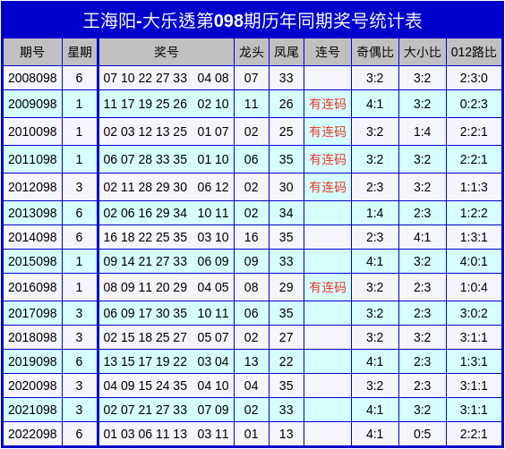 王海阳大乐透第23098期奖号分析:历史上第098期同期奖号已开出了15次,下图为历年第098期特征走势统计图表: