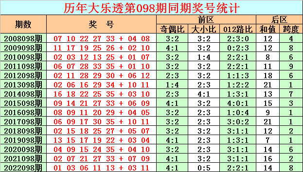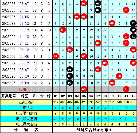 在历史同期奖号中,后区奖号跨度尾数大小比为8:7(定义:跨度1、2、3、10、11为小尾跨度,跨度4、5、6、7、8、9为大尾跨度),出现次数基本持平,本期预计开出大尾跨度,参考跨度6。