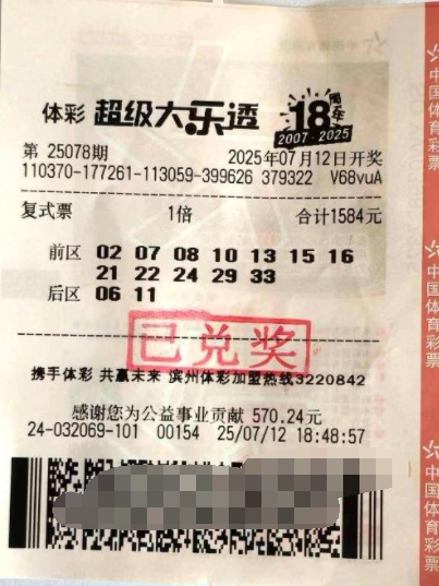 7月12日,超级大乐透第25078期开奖,开奖号码为前区:07、10、15、21、24,后区:05、06,全国共中出一等奖5注,滨州的王先生(化姓)凭借复式投注获得了二等奖1注、五等奖35注、八等奖210注、九等奖350注,总奖金达到81862元。王先生是一位生意人,购彩已有多年,平时工作繁忙,经常在各地间奔波,购买彩票也比较随意。中奖当天,王先生正好在滨州谈生意,路过一家彩票投注站时,他选择了12+2复式投注方式购买了一张大乐透彩票,随即匆匆离开。当晚开奖时,王先生发现自己差一步,后区仅错开1个号码,幸运地中了二等奖。
