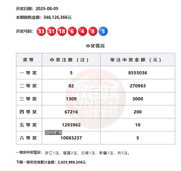 22:05 本期一等奖开出5注,单注奖金855万元,5注头奖分落4地,其中福建中出2注,浙江、云南、新疆各1注;二等奖开出82注,单注奖金27万余元。本期双色球全国销量为2.62亿余元,计奖结束后奖池余额为26.2亿余元。