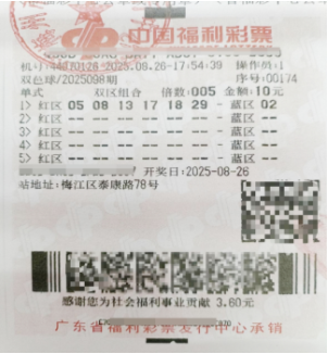 8月26日,中国福利彩票双色球第2025098期开奖,开奖号码为红色球05、08、13、17、18、29,蓝色球02,全国共开出22注一等奖,其中广东省梅州市梅江区泰康路78号福彩销售站点幸运中得一等奖5注。中奖的彩票是一张投注金额为10元的5倍1注单式票,中奖奖金高达2755万元。