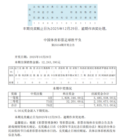 北京时间10月29日,胜负彩第25154期开奖结果揭晓。本期一等奖仅开出3注,单注奖金1,828,346元;二等奖开出73注32,201元;任九开463注20,318元。本期胜负彩销量为12,243,390元,任九投注总额为14,699,172元。