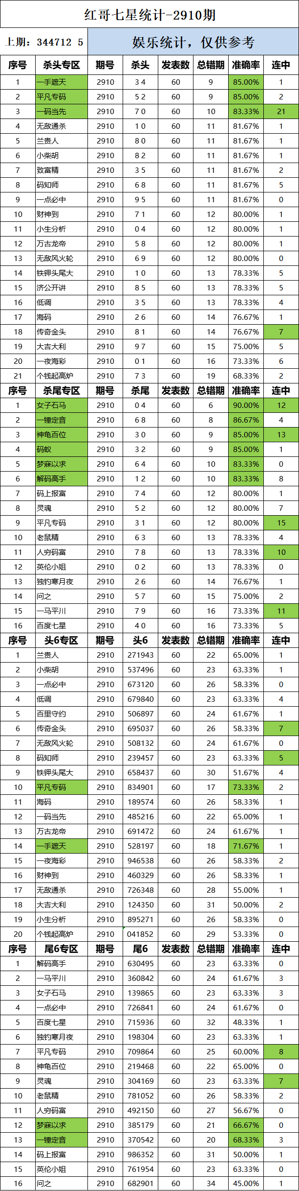 2910期:红哥统计 发表于:2023-07-10 12:01:12 浏览次数:1727 上一篇:2910期:七星出号统计 下一篇:2910期:二爹统计 【红炉点雪】 范围码15红10 点播25331期 【无敌通杀】 范围码15红9 点播25331期 【一手遮天】 范围码15红9 点播25331期 排列五杀码荣誉榜