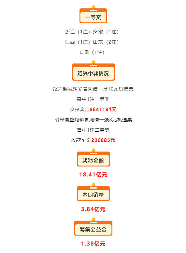浙江蛇年首日开市便迎来了双色球一等奖 发表于:2025-02-08 10:58:39 浏览次数:643 2月7日,“绍兴福彩”微信号发布消息称,双色球第2025012期浙江蛇年开市首注一等奖落户绍兴。绍兴越城地区中得1注一等奖,诸暨则中得1注二等奖。绍兴越城的购彩者凭借一张10元的机选票幸运中得一等奖,奖金为8641191元;而绍兴诸暨的购彩者凭借一张8元的机选票获得二等奖,奖金为206885元。 上一篇: 下一篇:一名吉林市男子幸运中得1034万元大奖 【春哥打奖】 范围码15红11 点播26030期 【天意人生】 范围码15红9 点播26030期 【彩女】 范围码15红9 点播26030期 双色球杀码荣誉榜