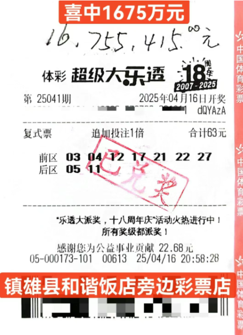 2025年4月16日,中国体育彩票大乐透游戏第25041期开奖,镇雄县西环路和谐饭店旁的一家体彩店传来喜讯,一位幸运彩民凭借一张花费63元的“超级大乐透复式票”成功中得大乐透追加一注奖金,最终收获1675万余元的大奖!这张中奖彩票的投注方式为复式票,并进行了1倍的追加投注,使得奖金金额大幅度增加。幸运彩民的这一注中奖不仅是一次个人的好运,也为该体彩店带来了丰厚的回报。中奖者与家人朋友共享喜悦的同时,也提醒其他彩民理性购彩,享受体彩带来的公益与娱乐。