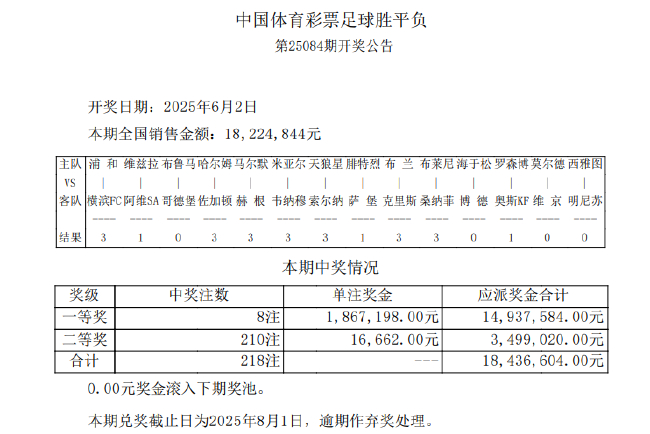 足彩25084期开8注186万元 677万滚存被清空