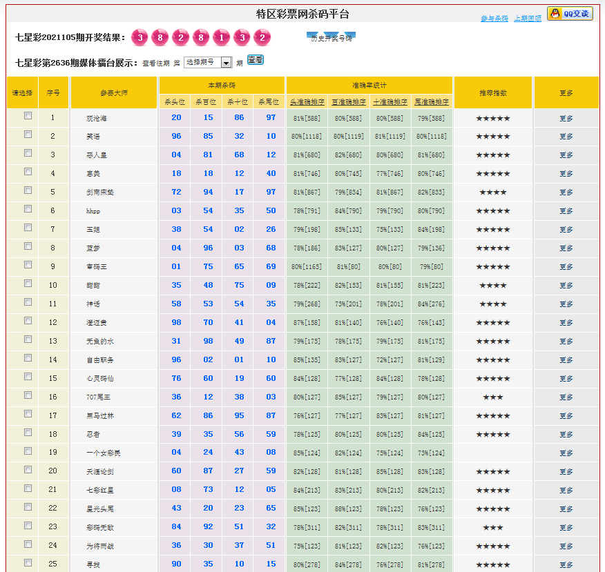 2636期:特区杀二头二尾平台统计 发表于:2022-10-14 09:52:15 浏览次数:685 详情登录 https://www.tqcp.net/kill_new_sj.php 上一篇:2635期:特区杀二头二尾平台统计 下一篇:2637期:特区杀二头二尾平台统计 【笑语】 范围码15红10 点播25326期 【天时地利】 范围码15红9 点播25326期 【无敌通杀】 范围码15红9 点播25326期 排列五杀码荣誉榜