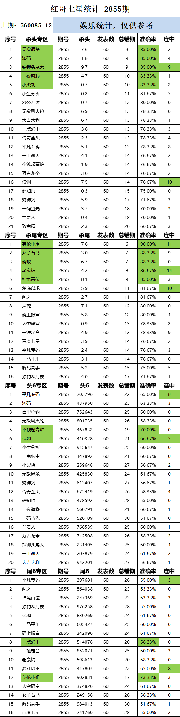 2855期:红哥统计 发表于:2023-03-04 12:01:03 浏览次数:2014 上一篇:2855期:特区杀三头三尾统计 下一篇:2855期:二爹统计 【笑语】 范围码15红11 点播25325期 【在现江湖】 范围码15红9 点播25325期 【天时地利】 范围码15红9 点播25325期 排列五杀码荣誉榜