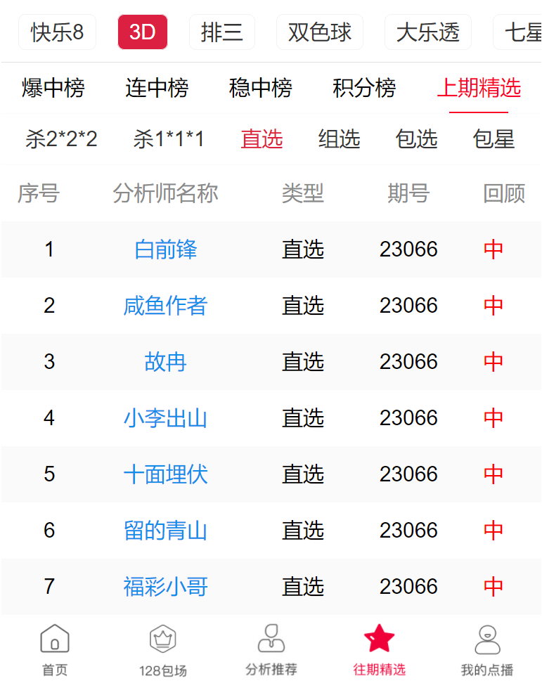 23067期:福彩3D 白前锋、咸鱼作者 等7位老师命中直选!