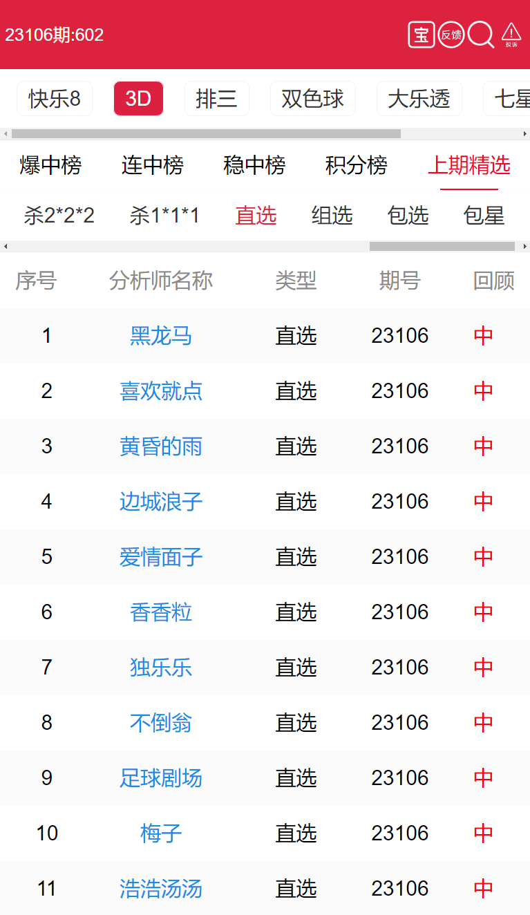 23107期:福彩3D 黑龙马、喜欢就点 等11位老师命中直选!