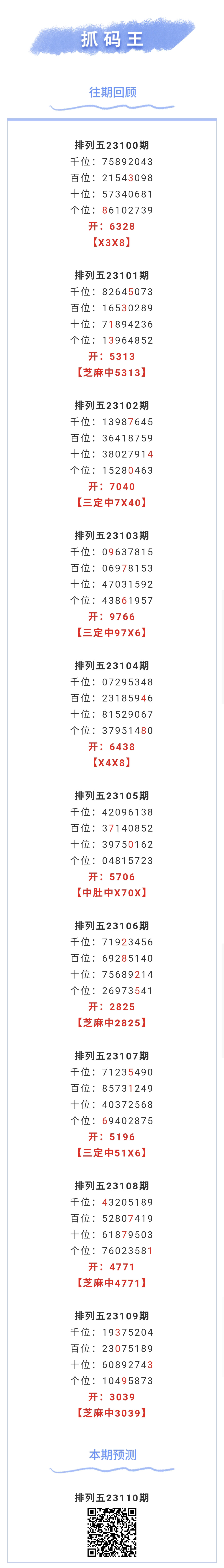 【排列五-110期】本月圈中14次芝麻,芝麻近10中4;上期芝麻中3039 发表于:2023-04-30 14:47:48 浏览次数:1009 上一篇: 下一篇:没有了 【无敌通杀】 范围码14红10 更新中 【笑语】 范围码14红9 更新中 【天时地利】 范围码14红9 更新中 排列五杀码荣誉榜
