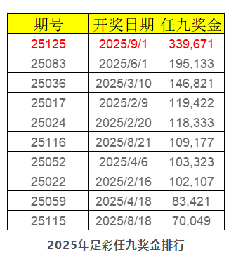 值得注意的是,本期任九的单注奖金33.9万元为2025年最高,且上次任九单注奖金突破30万元还要追溯至2024年12月(第24201期)。