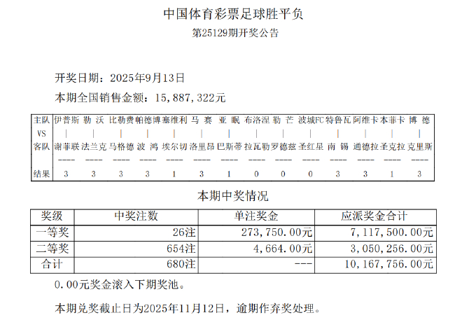 北京时间9月13日,足彩第25129期开奖结果揭晓。14场1等开出26注,单注奖金27.3万元,14场2等开出654注,单注奖金4664元。任九开出5542注,单注奖金2352元。本期足彩销量为15,887,322元,任九投注总额为20,372,214元。