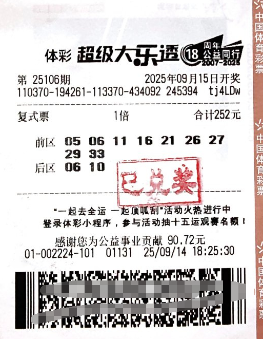 好运再次降临!9月15日,超级大乐透第25106期开奖,前区号码为05、06、11、26、29,后区号码为05、10。当期全国共中出12注一等奖和136注二等奖。来自济南的幸运购彩者张大爷(化姓),凭借一张9+2复式票,收获了包括1注二等奖、20注五等奖、60注八等奖、40注九等奖在内的多个奖项,总奖金达到100,564元。
