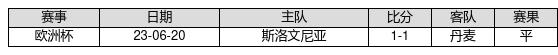 丹麦 VS 斯洛文尼亚两队近10年的交战次数为1场,丹麦0胜1平0负,赢球概率为0%,平局概率为100%,输球概率为0%。