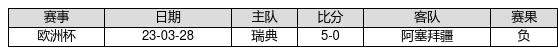 阿塞拜疆 VS 瑞典两队近10年的交战次数为1场,阿塞拜疆0胜0平1负,赢球概率为0%,平局概率为0%,输球概率为100%。