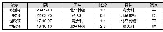 意大利 VS 北马其顿两队近10年的交战次数为4场,意大利1胜2平1负,赢球概率为25%,平局概率为50%,输球概率为25%。