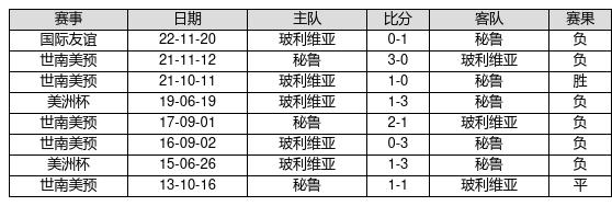 玻利维亚 VS 秘鲁两队近10年的交战次数为8场,玻利维亚1胜1平6负,赢球概率为12.5%,平局概率为12.5%,输球概率为75%。