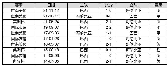 哥伦比亚 VS 巴西两队近10年的交战次数为10场,哥伦比亚1胜3平6负,赢球概率为10%,平局概率为30%,输球概率为60%。