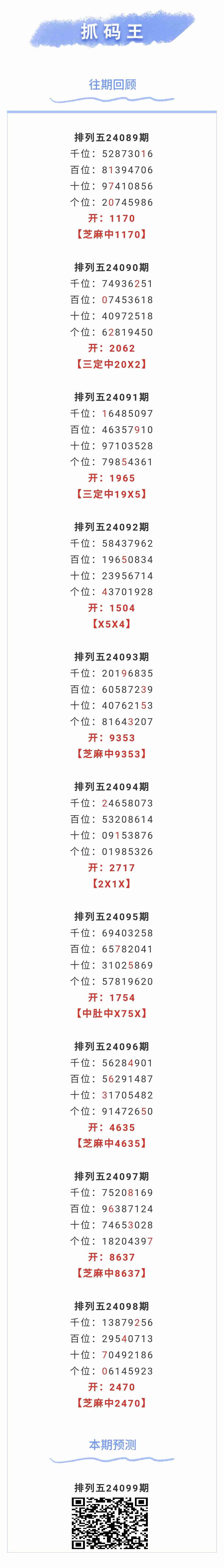 【排列五-099期】本月圈中10次芝麻,芝麻近10中5;上期芝麻中2470 发表于:2024-04-18 15:53:13 浏览次数:570 上一篇: 下一篇:没有了 【春哥打奖】 范围码15红10 点播26031期 【志存高远1】 范围码15红9 点播26031期 【彩女】 范围码15红9 点播26031期 排列五杀码荣誉榜