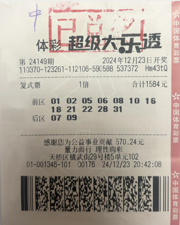 12月23日,体彩大乐透第24149期开奖,当期全国共中出3注一等奖,其中2注分别落在山东济南和烟台。济南的一位幸运购彩者凭借一张12+2复式投注票获得了1015万元的奖金。中奖第二天,江女士(化姓)便赶赴山东省体彩中心办理兑奖手续,她激动地表示:“中了大奖非常开心,也很激动,今天一早就赶来兑奖了。”江女士透露,她一直有购买大乐透的习惯,通常喜欢选择复式投注。兑奖结束后,她决定捐出2万元,用于支持公益事业,希望能尽一份微薄的力量。