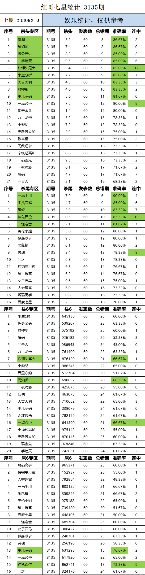 3135期:红哥统计 发表于:2025-01-04 10:33:13 浏览次数:896 上一篇:七星彩3135期特区杀三头三尾统计 下一篇:3135期:二爹统计 【笑语】 范围码15红10 点播25326期 【天时地利】 范围码15红9 点播25326期 【无敌通杀】 范围码15红9 点播25326期 排列五杀码荣誉榜