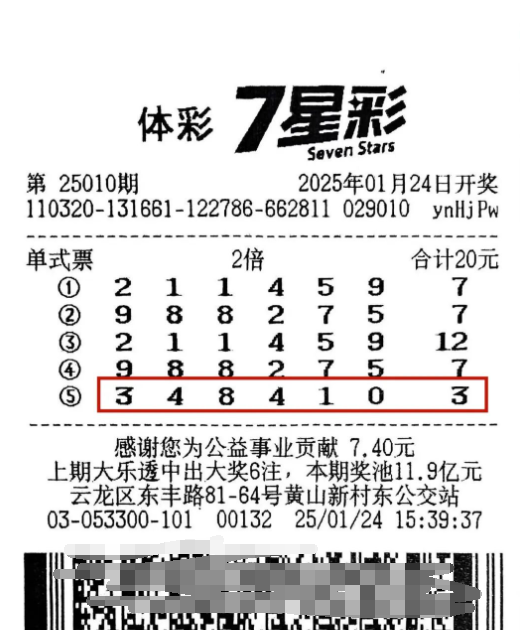 张先生的中奖票是在春节前购买的,来自7星彩第25010期。1月24日下午,他在徐州3203053300体彩站点购买了一张20元的7星彩单式票。该票包含5注号码,并进行了2倍投注。最终,其中一注号码“3 4 8 4 1 0 + 3”完美匹配当晚开奖的7星彩第25010期中奖号码,成功命中一等奖2注,每注奖金500万元,单票总奖金1000万元。