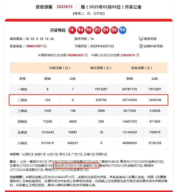 亲爱的彩友们,激动人心的好消息终于来了!就在2月9日晚,双色球开奖时,烟台又传来了喜讯——幸运的烟台彩友们再次中得1注二等奖!上一次中奖的热度还未完全散去,这次的惊喜又如约而至,简直让人觉得烟台的彩友们的运气好得无法言喻!每一次的中奖都让我们倍感兴奋,这样的好运是不是让你也忍不住心跳加速,迫不及待想知道更多的开奖信息呢?别急,大家的好奇心我完全理解,现在就给大家带来最新的开奖详情!