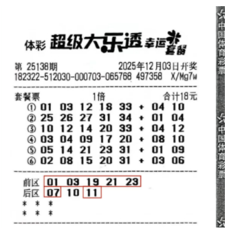 刘先生的中奖彩票是一张18元的大乐透套餐票,为随机选号,由6注单式号码和1组“5+3”复式投注组成,其中复式投注包含了大乐透第25138期开奖号码“01-03-19-21-23+07-11”。他除了中得1注722万余元一等奖,还收获2注20万余元二等奖,单票总奖金达到763万余元。