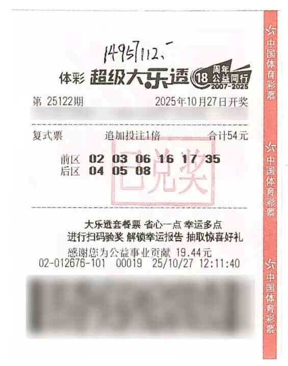 中奖彩票编者按:近日,河北彩民刘先生凭借1张“6+3”复式追加票,喜中大乐透游戏1495万大奖。刘先生接触彩票只有两三年,一直坚持守号投注。关于这次中奖,他非常感谢彩站老板向他介绍了追加玩法,让他的奖金多了不少。