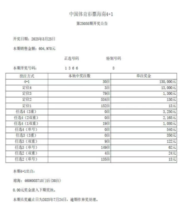 2025年5月25日晚,中国体育彩票海南4+1游戏第25058期开奖,海南省琼海市一位幸运购彩者中得30注一等奖,总奖金高达390万元。此次开奖的正选号码为“1 3 6 6”,特别号码为“8”。当期海南4+1游戏共中出30注一等奖,此外,定位4中出3注,定位3中出79注,定位2中出534注,定位1中出152注。这30注一等奖的幸运彩民来自琼海市嘉积镇人民路125号的实体店(编号4606003718)。