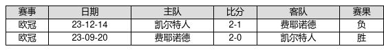 费耶诺德 VS 凯尔特人两队近10年的交战次数为2场,费耶诺德1胜0平1负,赢球概率为50.0%,平局概率为0.0%,输球概率为50.0%。