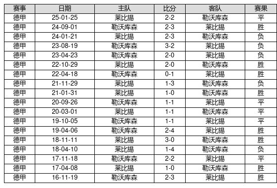 莱比锡 VS 勒沃库森两队近10年的交战次数为18场,莱比锡8胜5平5负,赢球概率为44.4%,平局概率为27.8%,输球概率为27.8%。