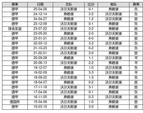 沃尔夫斯堡 VS 弗赖堡两队近10年的交战次数为21场,沃尔夫斯堡9胜3平9负,赢球概率为42.9%,平局概率为14.3%,输球概率为42.9%。
