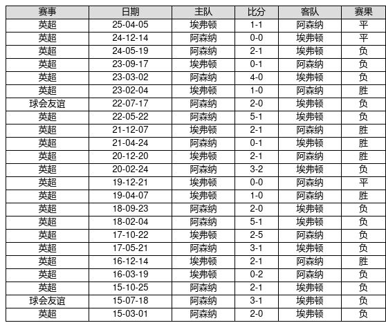 埃弗顿 VS 阿森纳两队近10年的交战次数为23场,埃弗顿6胜3平14负,赢球概率为26.1%,平局概率为13.0%,输球概率为60.9%。
