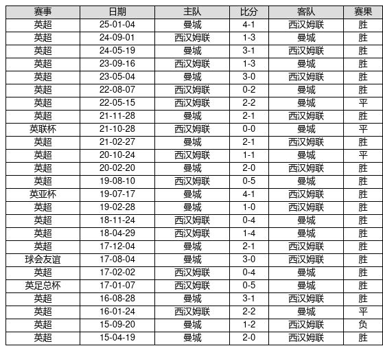 曼城 VS 西汉姆联两队近10年的交战次数为25场,曼城20胜4平1负,赢球概率为80.0%,平局概率为16.0%,输球概率为4.0%。