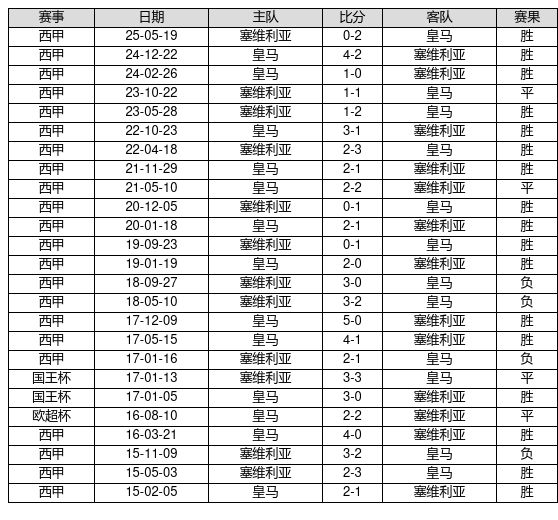 皇马 VS 塞维利亚两队近10年的交战次数为25场,皇马17胜4平4负,赢球概率为68.0%,平局概率为16.0%,输球概率为16.0%。
