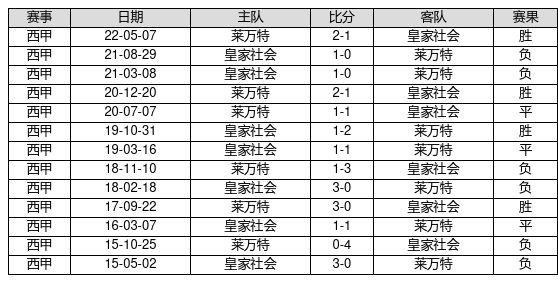 莱万特 VS 皇家社会两队近10年的交战次数为13场,莱万特4胜3平6负,赢球概率为30.8%,平局概率为23.1%,输球概率为46.2%。