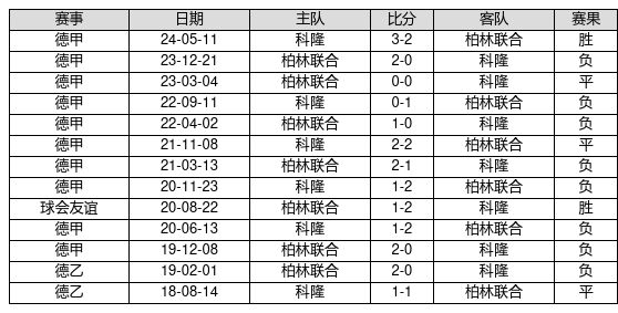 科隆 VS 柏林联合两队近10年的交战次数为13场,科隆2胜3平8负,赢球概率为15.4%,平局概率为23.1%,输球概率为61.5%。