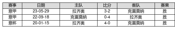 拉齐奥 VS 克雷莫纳两队近10年的交战次数为3场,拉齐奥3胜0平0负,赢球概率为100.0%,平局概率为0.0%,输球概率为0.0%。
