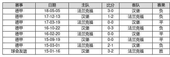 汉堡 VS 法兰克福两队近10年的交战次数为8场,汉堡1胜3平4负,赢球概率为12.5%,平局概率为37.5%,输球概率为50.0%。
