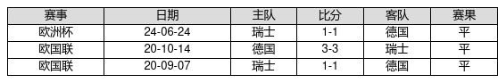 瑞士 VS 德国两队近10年的交战次数为3场,瑞士0胜3平0负,赢球概率为0.0%,平局概率为100.0%,输球概率为0.0%。