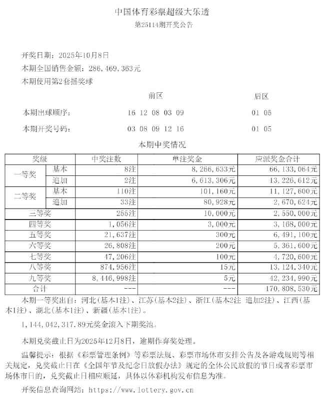 本期全国销量为2.86亿元,奖池方面,11.44亿余元滚存至10月11日(周六)开奖的第25115期。